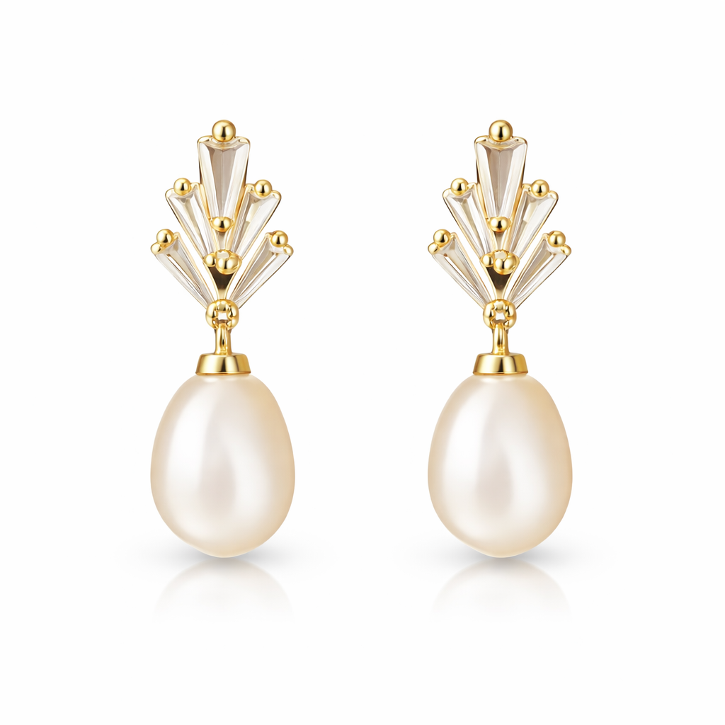 Gold Fan Crystal Pearl Drop Earrings